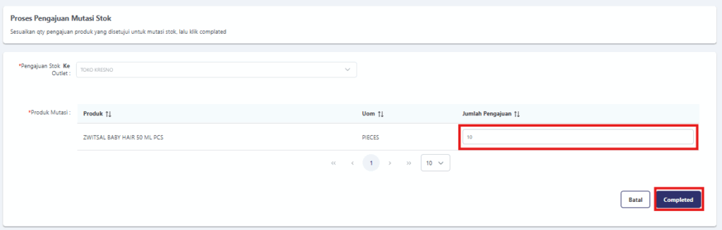 8. Pada salah satu permintaan mutasi yang masuk, klik tombol Atur, lalu pilih opsi Completed untuk memproses dan menyetujui permintaan stok tersebut. Atur jumlah kebutuhan sesuai dengan stok yang ada di toko.